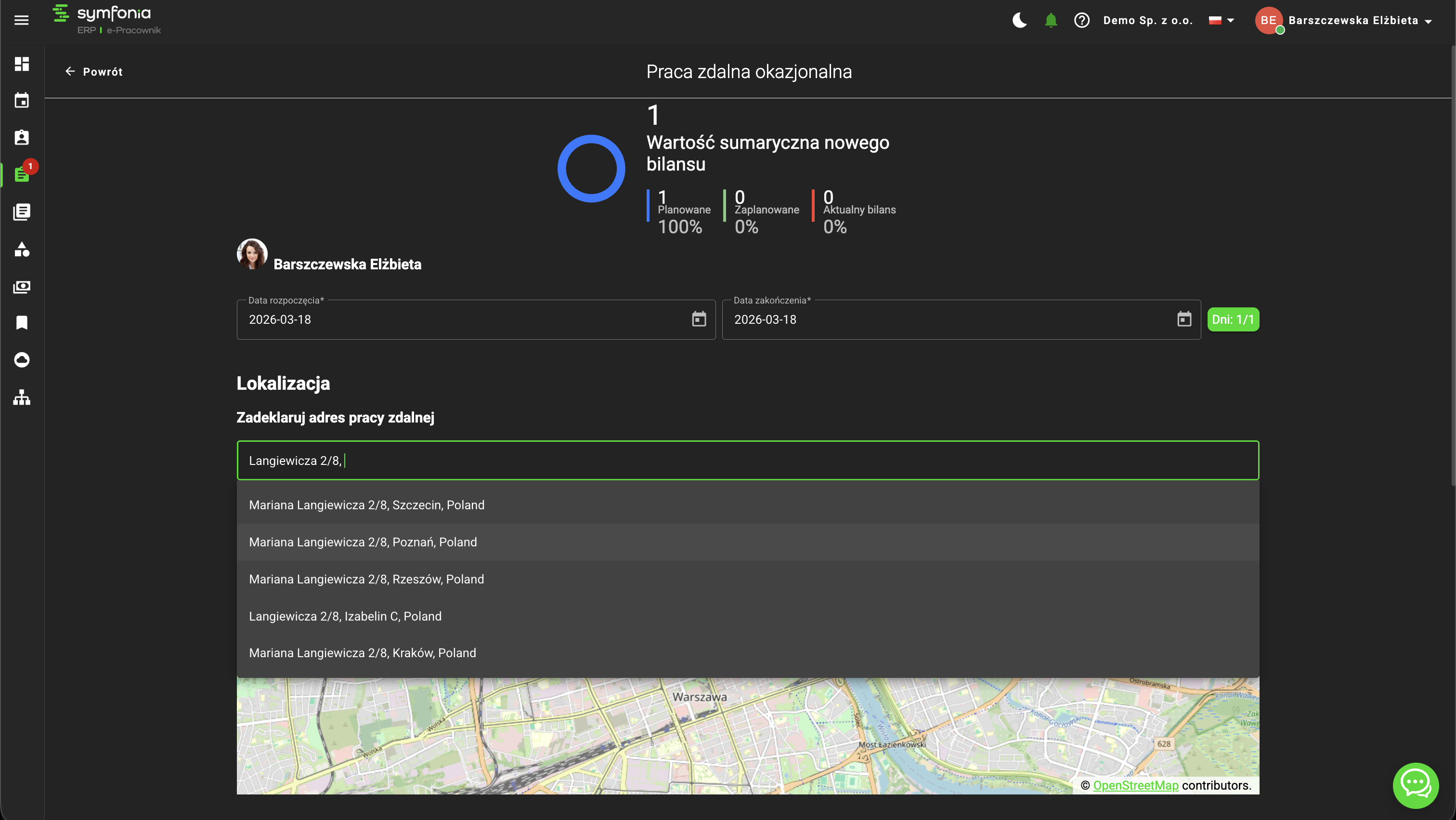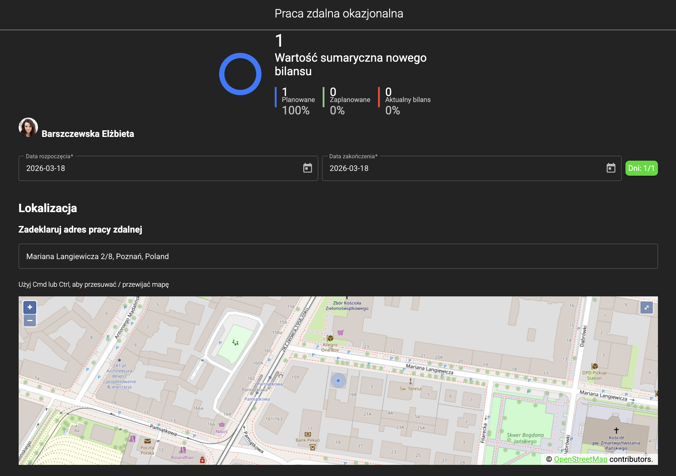 Podczas składania wniosku o pracę zdalną pracownik wskazuje adres wykonywania pracy – może go wpisać ręcznie lub skorzystać z automatycznych podpowiedzi adresów na podstawie danych Google. Po wyborze pełnego adresu system prezentuje jego lokalizację na mapie (mapa ma charakter podglądowy i nie służy do wyboru lokalizacji).